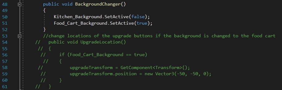 As shown in the above screenshot, the text in green was an attempt to change the locations of the upgrade buttons as they stayed in the same position once the background had been changed. This meant that the upgrade buttons looked out of place, so I attempted to change the locations with an experimental code. Unfortunately, it did not work; therefore, I relocated the upgrade buttons to the centre of the game.