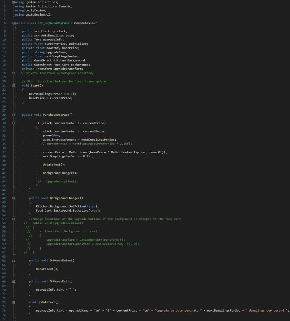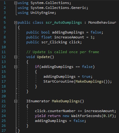 Another upgrade feature I added was an upgrade which enabled the player to purchase an item which allowed them to generate dumplings automatically. But to do this, we needed a way to generate dumplings at a set amount of time. This is when a new concept was introduced to me which was “Coroutine”. Coroutine allows me to start the auto generating dumplings and then wait for 0.1 seconds (as shown in the script) before returning to the if statement of “addingDumplings == false”.
