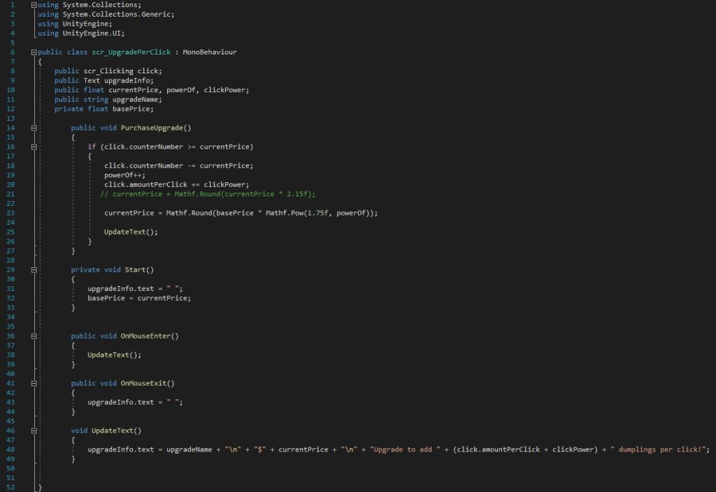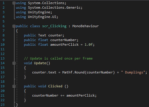 The first script that I needed to create was the code which counted the number of clicks that the player has clicked. The code also integrates the amount of clicks and displays it onto a UI text. This informs the player of the amount of dumplings that they have created through number of clicks that they did.