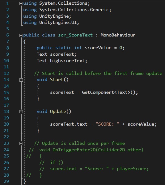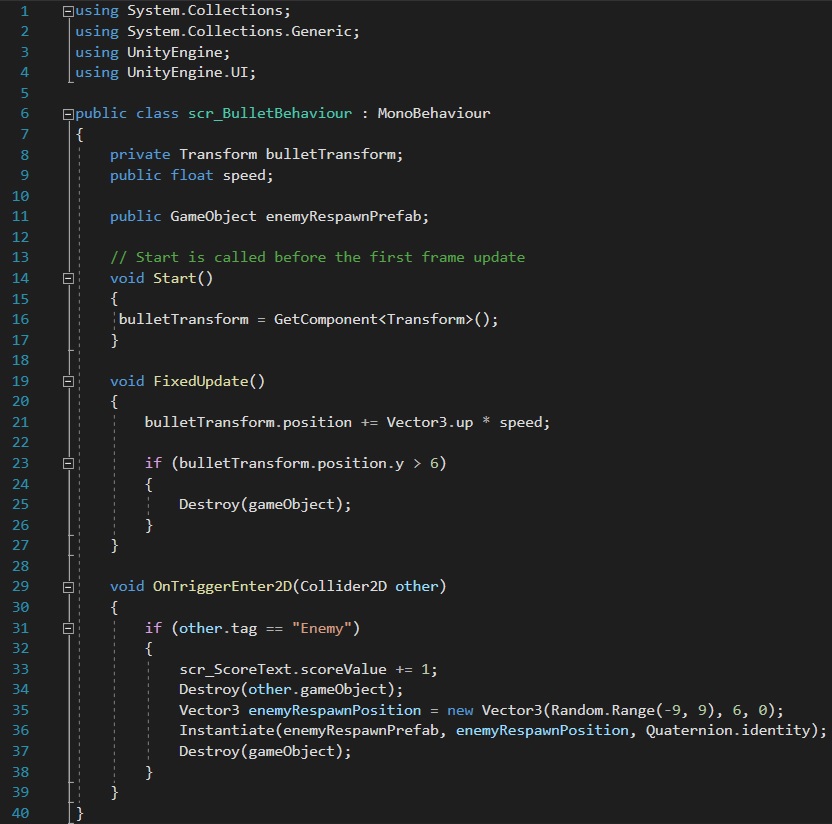 Similarly to the health script, the score script has also been referenced within other scripts such as scr_BulletBehaviour. Within that script, once the projectile collides with the enemy 1 is added to the score.