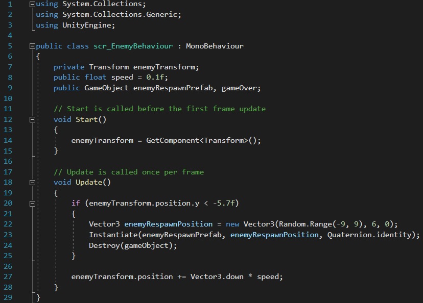 Once the player and projectile scripts were finished, I needed to create a script for the enemy (right). Similar to the player behaviour script, I needed the transform component to grab the position of the enemy. Once this has been created as a variable, I added an if statement which destroys the enemy if the player fails to kill them and the enemy moves out of the screen. As the variable holds the current position of the enemy, all I needed to do was to ensure that the enemy respawns if “y” coordinate is “< -5.7”.