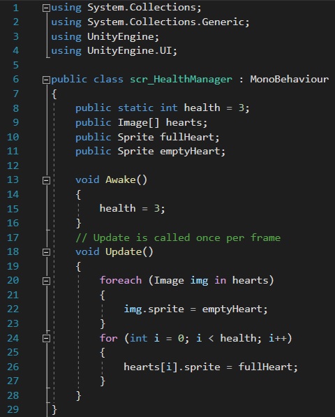 To begin with, I needed to create a static integer variable that holds the information of how much health that the player has, in this case the player has 3. As this health script references the sprites used, I would need to implement them into the script.