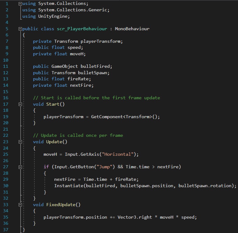 As for the projectiles, I included an if statement. By adding “Input.GetButton(“Jump”)” (Unity, 2022) makes the statement true if the button within the quotations marks is held down, so in this case, “Jump” would be spacebar. When spacebar is pressed, this allows the player to fire projectiles. Furthermore, to ensure that the projectiles were able to shoot at a reasonable standard, two float variables was added to the code, “fireRate” and “nextFire”. The fireRate was created as a public variable which enables me to alter the number through Unity which made it easier to quickly change the speed of the projectiles to my liking. But to get the projectiles working properly, it is necessary for me to add the game object to the script so that the code understands where the projectile will be fired from.