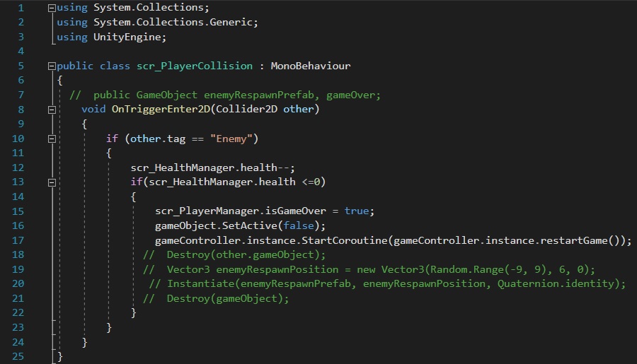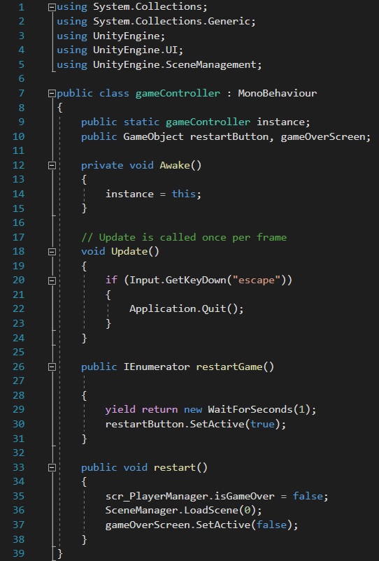 One final feature for our game to work in sync another script is a game controller script, this is needed to enable the player to restart the game. In order to do this, I need to use the “StartCoroutine” function (Unity, 2022) (Rudra Gesota, 2018) which is referenced in the “scr_PlayerCollision” script; the way in which coroutine works is that once it has been activated, it pauses execution and then resumes after a set amount of seconds (Unity, 2022). In this case, the coroutine begins when the player has lost all their health which triggers the “restartGame” variable; this results in the coroutine waiting for 1 second before displaying the restart button.