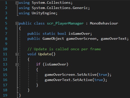 The variable “isGameOver” activates once the player loses all of their health. When this variable becomes true, a game object within Unity also becomes true. In this case, my two game objects are the background for the game over screen and the text. Once the variable activates, the game over background and text is overlayed on top of the game.
