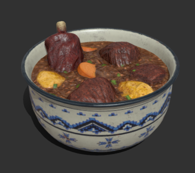 mickeymoose1204 (2023) Bowl of pork stew [3D Asset]. Available online: https://sketchfab.com/3d-models/bowl-of-pork-stew-9c6709fe8eee4bf1b225ddf24d2b8965 [Accessed 1/05/2023].