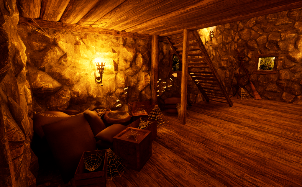 Throughout the interior, I implemented the use of cobwebs to express the witch’s personality.