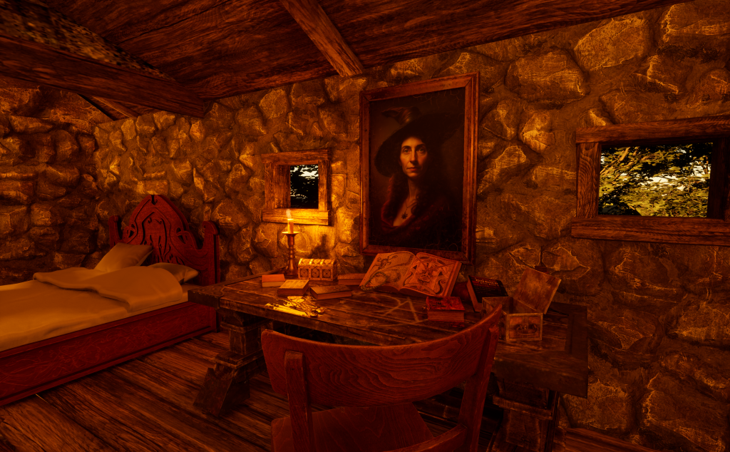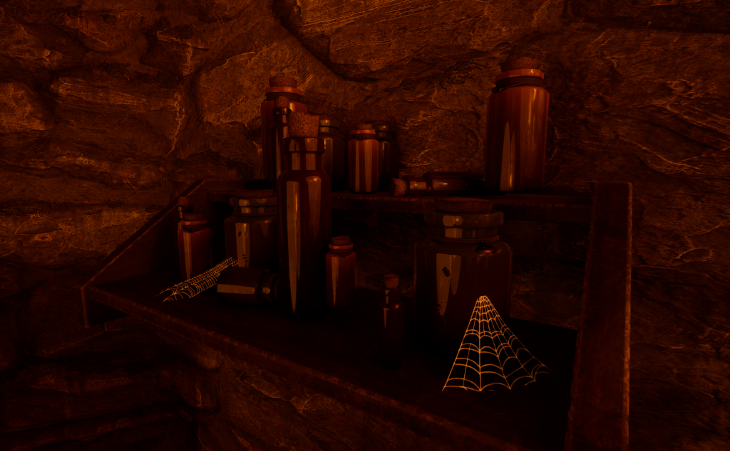 The assets that I have added into my environment all play their own part to help me tell the narrative of the swamp and the witch who resides within. I have carefully selected my assets and added potion bottles, spell books, and jewelry to inform the audience that a witch resides within the cabin; along with regular assets such as kitchen and dining utensils for the daily lifestyle of the witch.