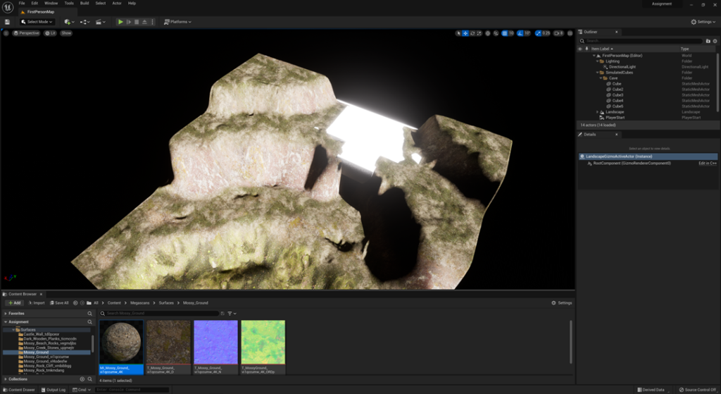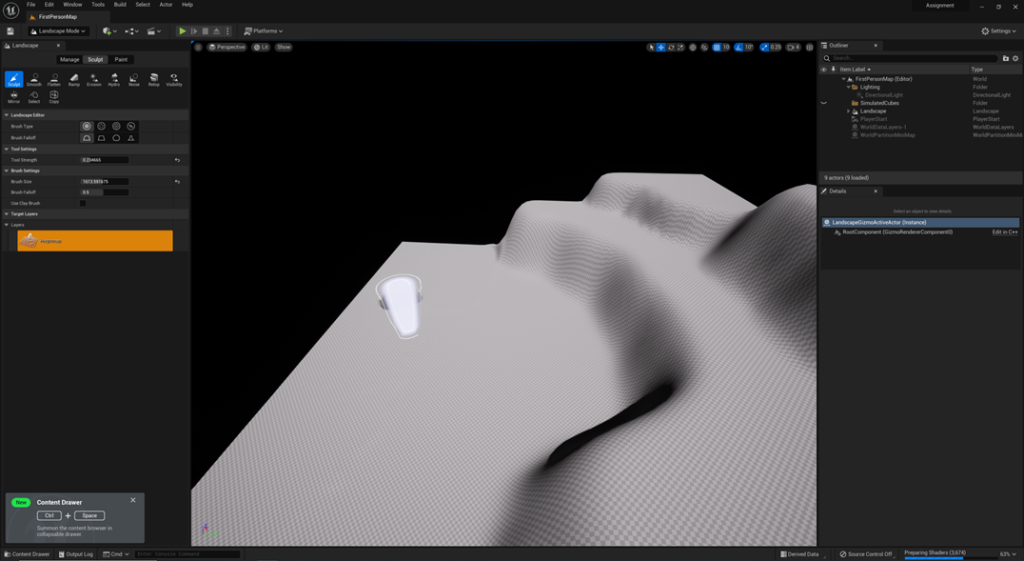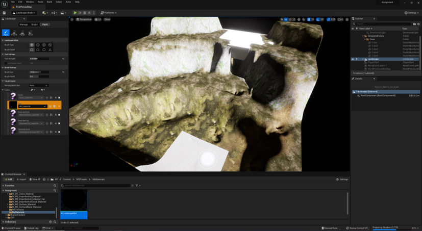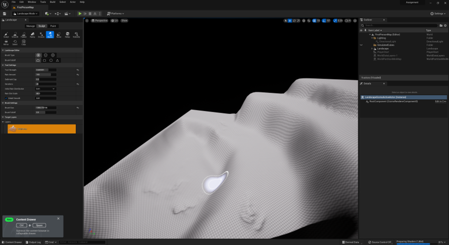 To begin with, I first started to sculpt out my landscape in ‘Landscape Mode’. I experimented with the different tools such as ‘Sculpt’, ‘Flatten’ and ‘Smooth’ to create the overall layout. With these tools, I was able to create a higher surface and flatten to create an even surface and smooth the edges of the landscape. Because my environment is a swamp, I used the ‘Hydro Tool’ to create small pits to mimic the rain effect on the ground.