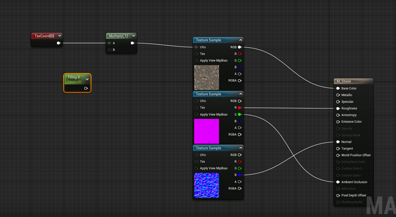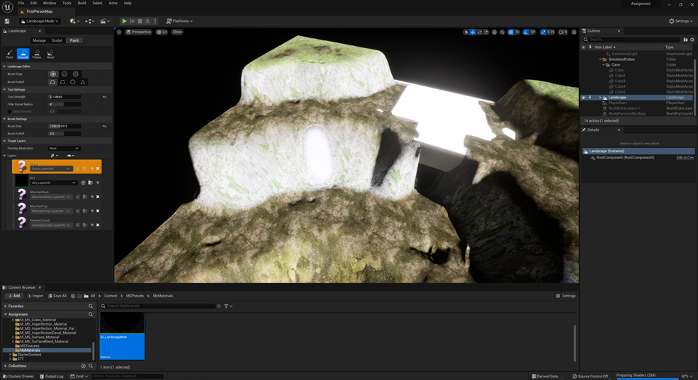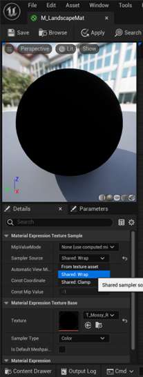 Once I had completed sculpting my landscape, I create a new material and applied it to the landscape. When attempting to paint using the added surfaces, I came across a problem where the textures wouldn’t load; to solve this, I opened the material editor and selected all the texture samples and switched the sampler source to ‘Shared Wrap’.
