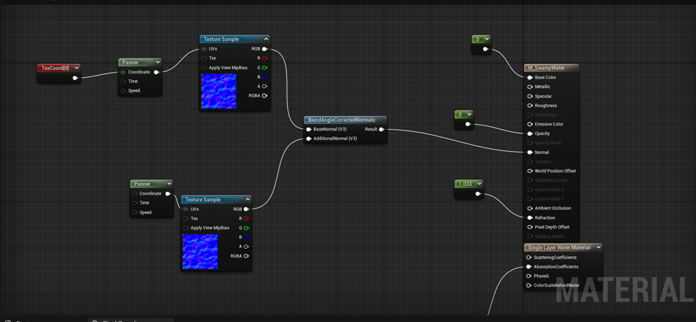 I followed a tutorial to create water(), the first step was to create a material. Once the material editor was opened, I added 4 notes and a parameter. I added the desired texture sample, panner, texcoords and blended them to create the water-like movement.