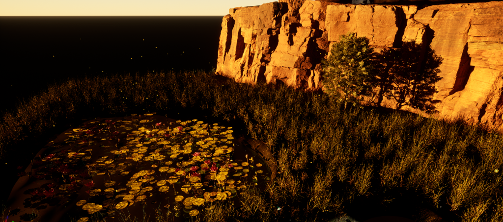 In a swamp environment, I wanted to fireflies to be included to give the environment some personality. To do this, I created a Niagara system and added the fountain emitter. When opening up the editor, I ticked the “Local Space” emitter under properties and experimented with the spawn rate, switching it from 90 to 500. Under the category particle spawn and within shape location, I changed the shape primitive from sphere to cylinder and altered the height and radius. Switching to the add velocity tab, I changed the velocity mode from “in cone” to “from point” and changed the minimum and maximum speed then deleted the gravity. And adjusted the drag value. Added curl noise force and altered the set range to random between 300 and 850.
