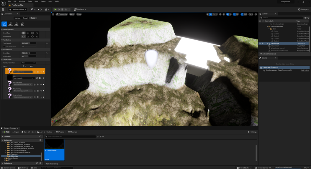 Once I had completed sculpting my landscape, I create a new material and applied it to the landscape. When attempting to paint using the added surfaces, I came across a problem where the textures wouldn’t load; to solve this, I opened the material editor and selected all the texture samples and switched the sampler source to ‘Shared Wrap’.