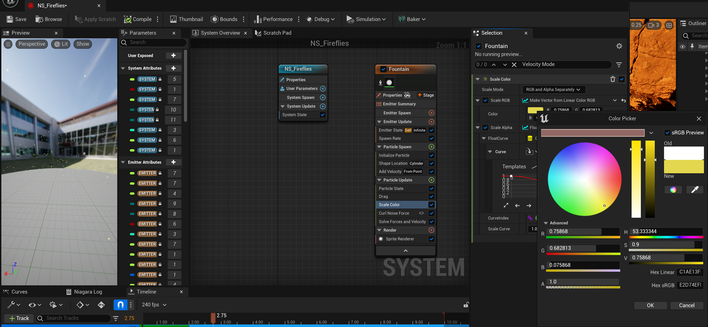 In a swamp environment, I wanted to fireflies to be included to give the environment some personality. To do this, I created a Niagara system and added the fountain emitter. When opening up the editor, I ticked the “Local Space” emitter under properties and experimented with the spawn rate, switching it from 90 to 500. Under the category particle spawn and within shape location, I changed the shape primitive from sphere to cylinder and altered the height and radius. Switching to the add velocity tab, I changed the velocity mode from “in cone” to “from point” and changed the minimum and maximum speed then deleted the gravity. And adjusted the drag value. Added curl noise force and altered the set range to random between 300 and 850.