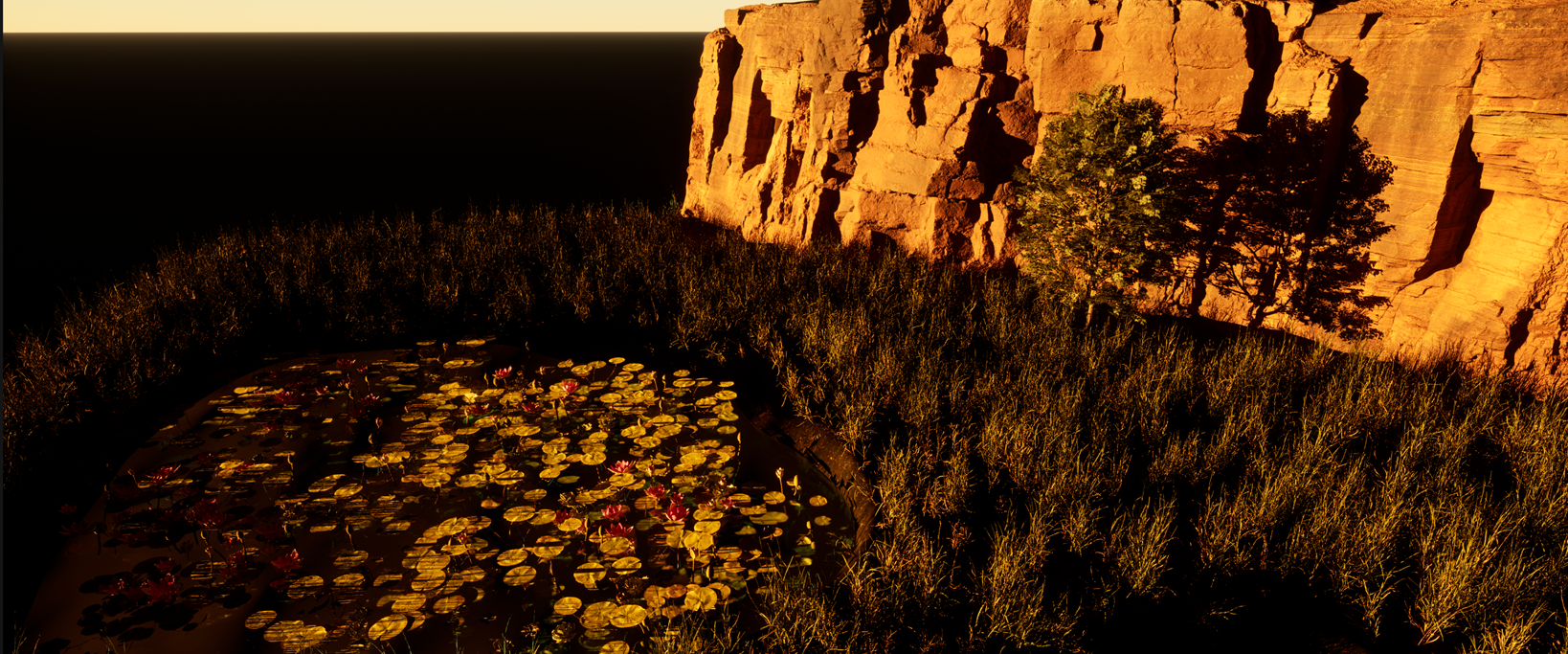 During the design process, it was important to consider the assets that I implement in my environment. The narrative that I wanted to tell is a witch residing in a swamp, who lures children and sacrifices them to use as an ingredient for a potion to keep her young and beautiful; combined with another ingredient, the lotus flowers which is symbolic of rebirth and beauty which I also added into my environment. Below her cabin situates a cave with skulls and bones scaled small to regular size to imitate a child’s skull.