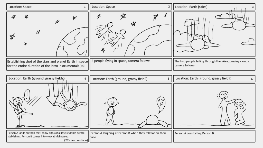 Next, the camera will cut to the next scene showing a grassy environment with trees surrounding the area. The camera will be stationary, and two people will come into view as they are falling down to Earth. When the people land, it will cut to the next scene of Person A laughing at Person B as they fall flat on their face and then Person A comforting Person B. The camera will cut again to the next scene showing an over-the-shoulder shot of them sitting next to each other and talking, the camera will pan upwards to show the stars and moon.