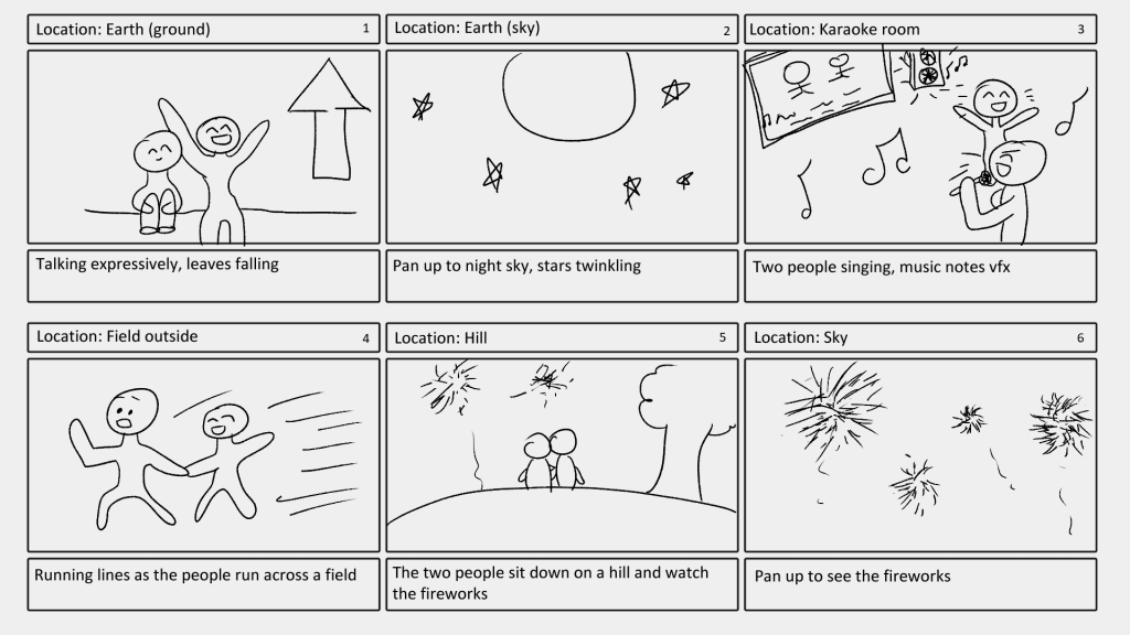 The story begins by introducing two characters as they fly towards Earth from outer space. They’re seen falling through the skies and losing control of their flying ability as they plummet down to Earth. One lands gracefully while the other lands flat on their face. The following scene shows the two characters conversing with each other and a flashback happens as they reminisce on their past; they’re shown singing together and flashforward happens where they’re seen running through a field in a rush to see the fireworks. They reach the hill and sit down together to watch the fireworks.