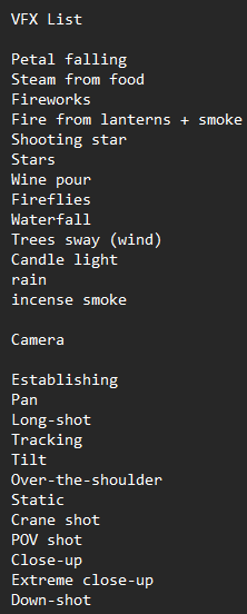 I created a VFX list to note down the different visual effects that I needed to create so I could then proceed to do research on how to create them within Unreal Engine. I also created a list of different camera sequences to remind myself of different camera shots that I could incorporate into my music video so there’s a variety.