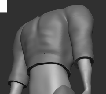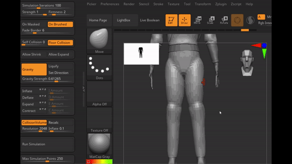Once this was completed, I needed to use ‘Dynamics’. The basic function of ‘Dynamics’ allows me to imitate the material of the clothing; to elaborate, with the ‘Gravity’ setting on low and ‘Collision Volume’ on, once simulation begins the selected subtool sinks into the other subtools when making contact with it. As shown in the GIF below, simulation is manually turned on and off to ensure that the appropriate amount is applied to the subtool. This function also creates slight creases (as seen in the sleeves) which produces appealing material resembling clothes.