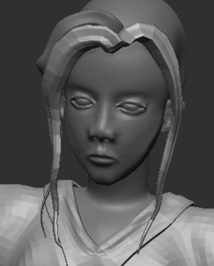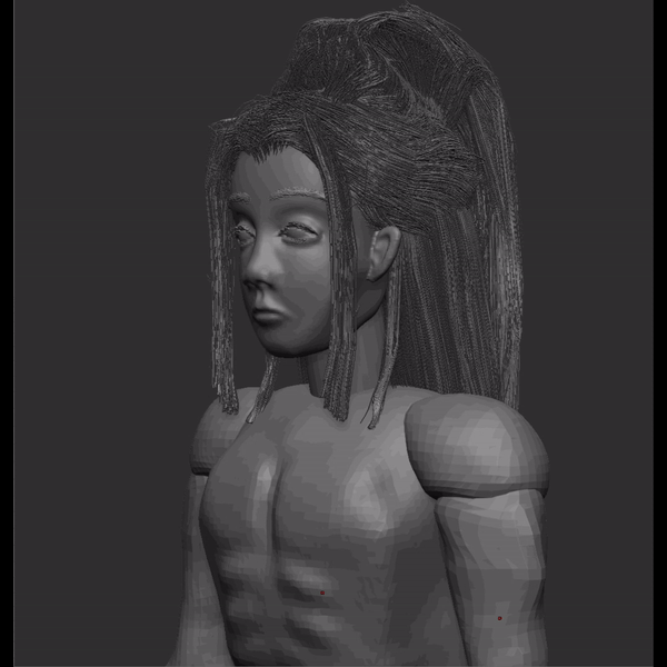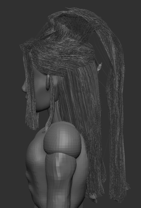 Throughout the process of creating the hair, the ‘Mask Pen’ brush was regularly used to select specific areas and separate them from the rest in order to create a new polygroup using CTRL + W; this allows me to section off the hair so I can then use the ‘Move’ brush to proportion the areas so I can shape them to the desired design.
