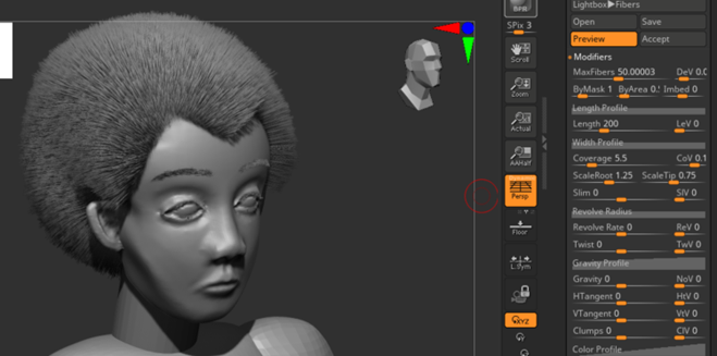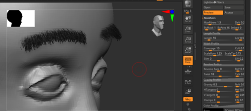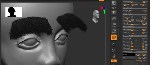 By following the tutorial by J Hill (2019), I downloaded and used the presets provided for the hair and imported them into ZBrush. I began by using the ‘Mask Pen’ brush to outline the area for the eyebrows, then under the ‘Fibermesh’ option, I experimented with the settings of ‘Max Fibers’ and the length by lowering the number until it looked suitable.