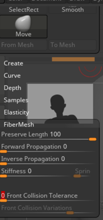 As seen in the above image, the hair from the eyebrows appear as though they are protruding from the face, rather than look combed; to solve this issue, I needed to edit the settings of the ‘Move’ brush by adjusting the ‘Preserve Length’ option to 100 and ‘Front Collision Tolerance’ to 0. By doing this, the ‘Move’ brush maintains the length of the hair when I draw across the eyebrows to smooth them out. Additionally, I experimented with the ‘Pinch’ brush to shape the eyebrow appropriately.