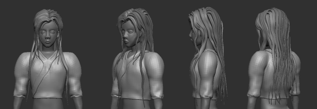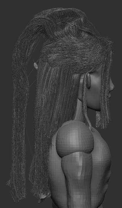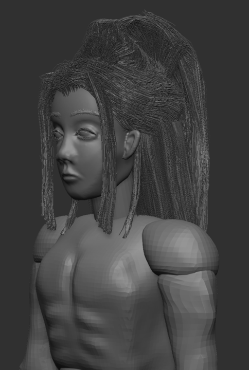 After looking at the outcome of my character, I realised that the realistic style of the hair clashed with the rest of the stylised design of the character; therefore, I decided to recreate the hair with a more stylised approach.
