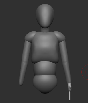 To begin the blockout, I followed the tutorial to create the basic shapes of anatomy. I started with the head by inserting a sphere and adjusting the shape with the ‘Move’ brush. By altering the size of the brush and enabling symmetry, I was able to create a head shape for my character. Once the blockout for the head was finished, I inserted a cylinder for the neck and used the ‘Transpose’ tool to adjust the size and move the cylinder beneath the head to form the neck. I followed a similar process throughout the blockout stage to create the torso and arms, using the ‘Move’ brush to reshape the spheres to form the appropriate body part.