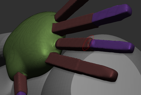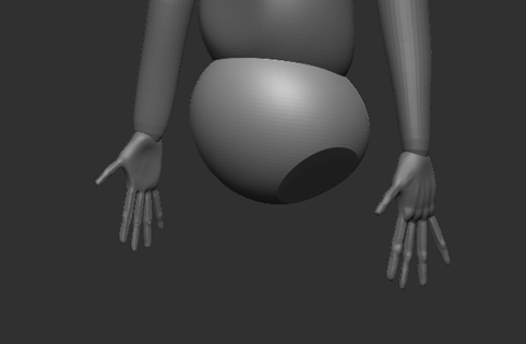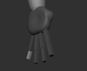 When I started on the hands, I found some difficulty using the ‘IMM Primitives Shapes’ brush to insert the cubes and resizing them onto the palm; but with trial and error, I finally created the basic block out. Because the subtool for the palm is selected, it was not necessary to merge them together as the fingers were created within the same subtool; therefore, in order to make the fingers less blocky, I needed to use the ‘DynaMesh’ tool. By selecting ‘Group’ then ‘DynaMesh’, the tool allows the user to freely sculpt the shape easily which enables me to smooth out the fingers (using the ‘Smooth’ brush) and reshape them to appear rounder.’ ‘DynaMesh’, the tool allows the user to freely sculpt the shape easily which enables me to smooth out the fingers (using the ‘Smooth’ brush) and reshape them to appear rounder.