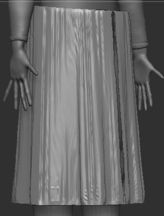 Once this is done, I am left with the two planes which are the top and bottom parts of the skirt. Complying with the tutorial, I used the ‘Curved Bridge’ tool to select both planes in order to create a bridge between them; this tool connects the edges of the two planes together, producing the skirt shown below. As it looks rather rigid, I used the ZRemesher tool and selected ‘KeepGroups’ to make it look smoother and deleted hidden again for any excess parts.