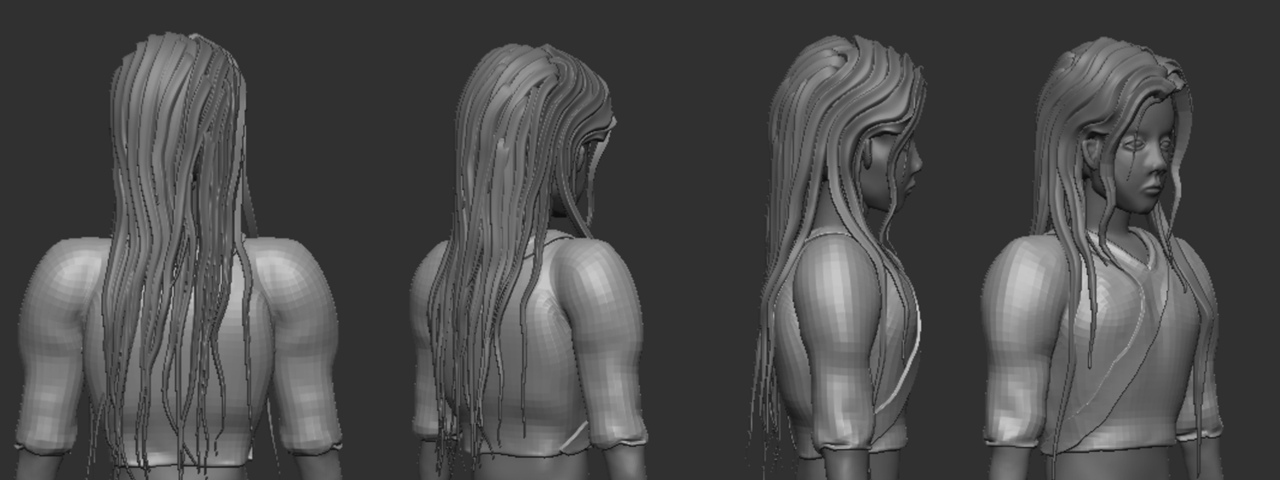 After looking at the outcome of my character, I realised that the realistic style of the hair clashed with the rest of the stylised design of the character; therefore, I decided to recreate the hair with a more stylised approach.