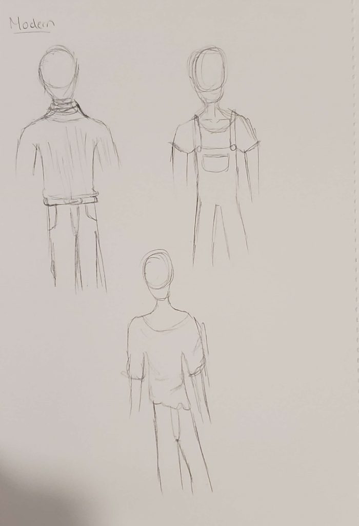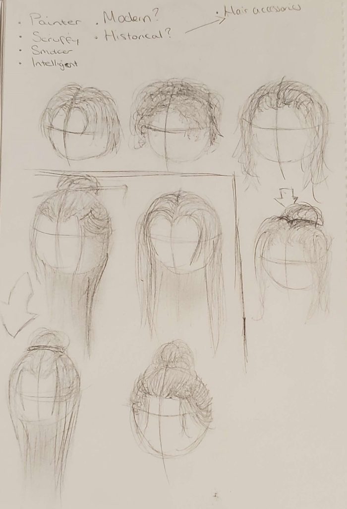 I wanted to explore the ideas of a more modern character like the character from my Scriptwriting module, so I designed modern outfits a painter would wear, but ultimately decided on traditional.