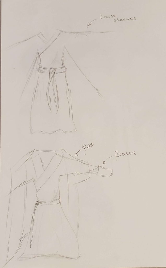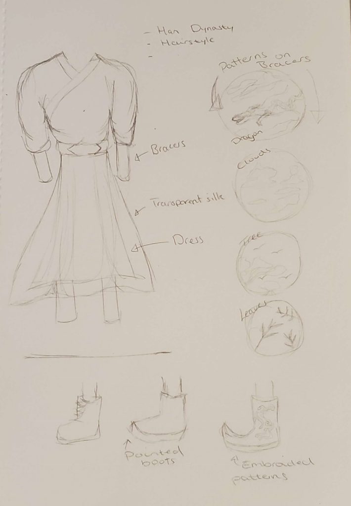 For the clothing, I researched different dynasties of clothing and produced a moodboard to work from. Using the moodboard, I sketched out different ideas of hanfu throughout the dynasties and ultimately opted for the Han dynasty.