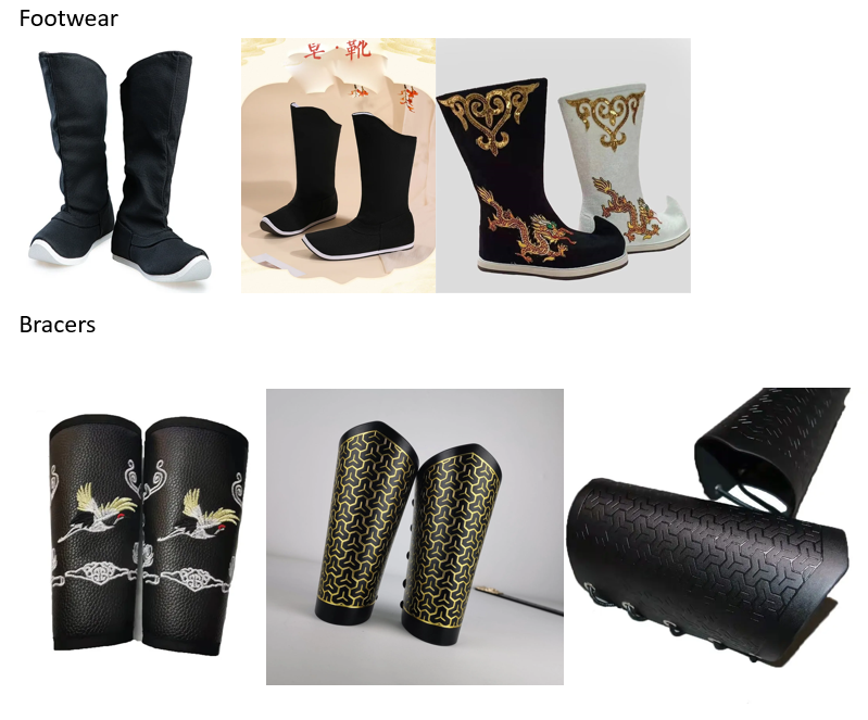 Furthermore, I want to go into detail with the design on the bracers to further represent my character; therefore, I sketched ideas such as dragons and other designs that may have been present during the Han dynasty. For footwear, I sketched a few ideas for boots and embroidered patterns on them.