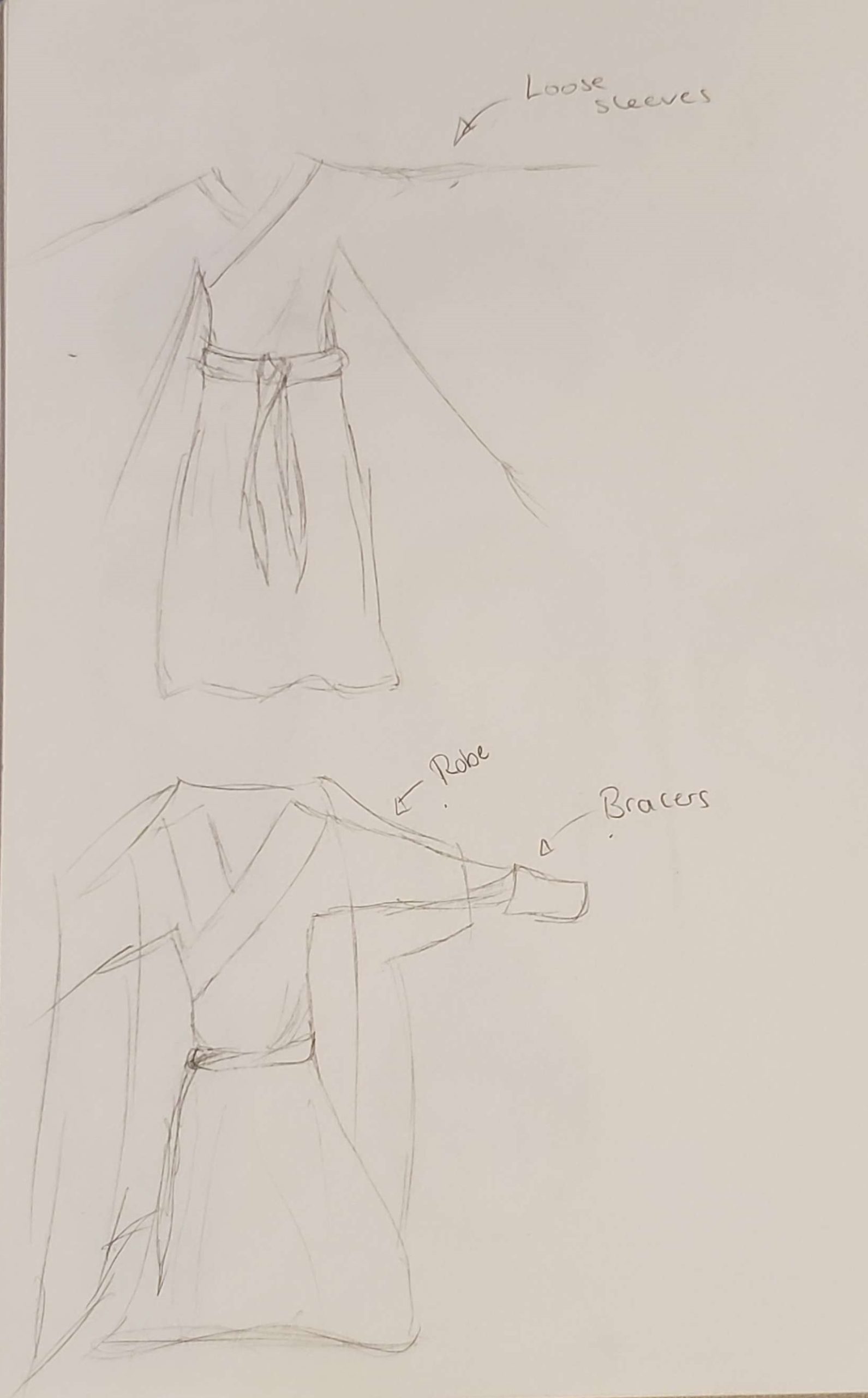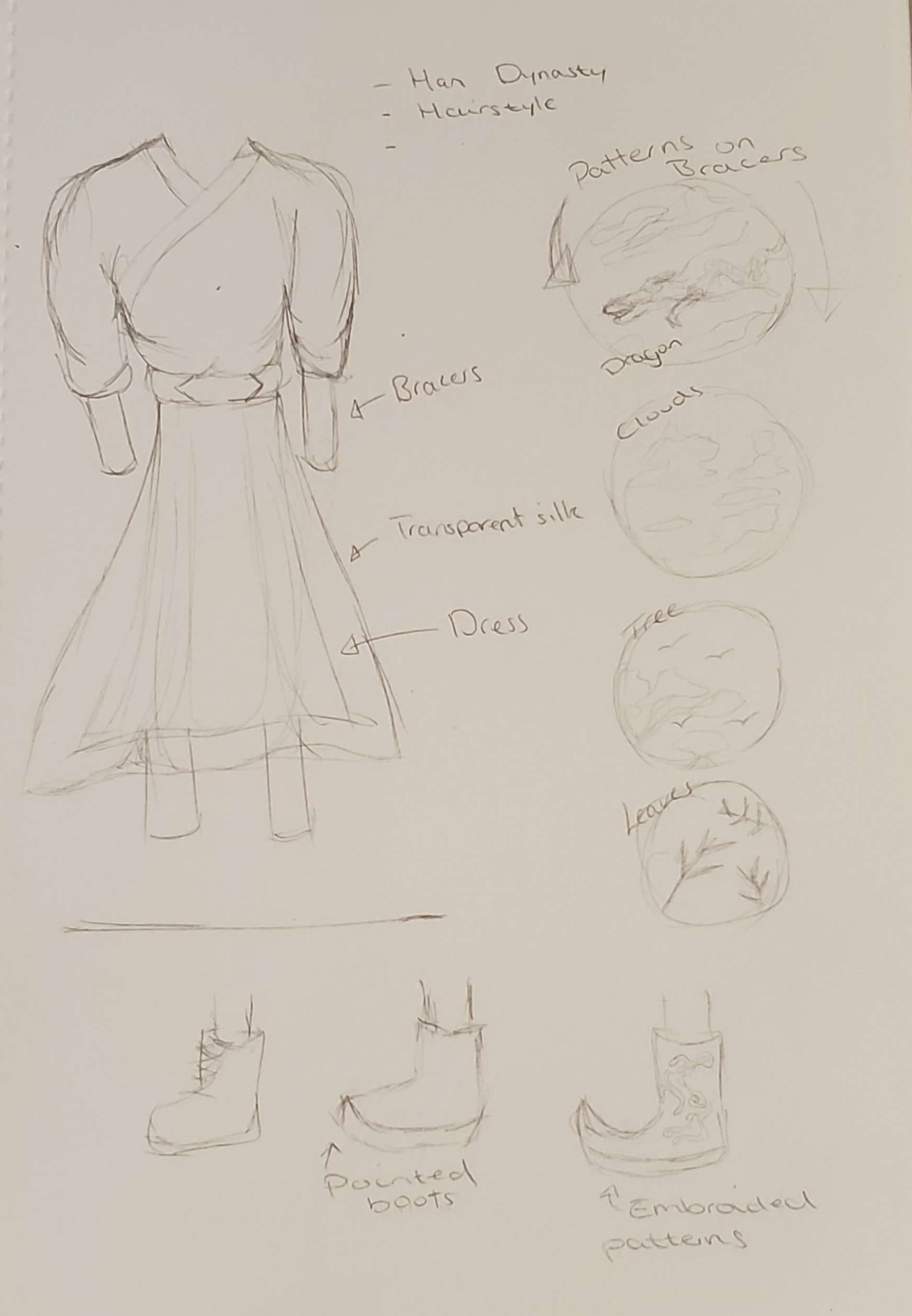 For the clothing, I researched different dynasties of clothing and produced a moodboard to work from. Using the moodboard, I sketched out different ideas of hanfu throughout the dynasties and ultimately opted for the Han dynasty.