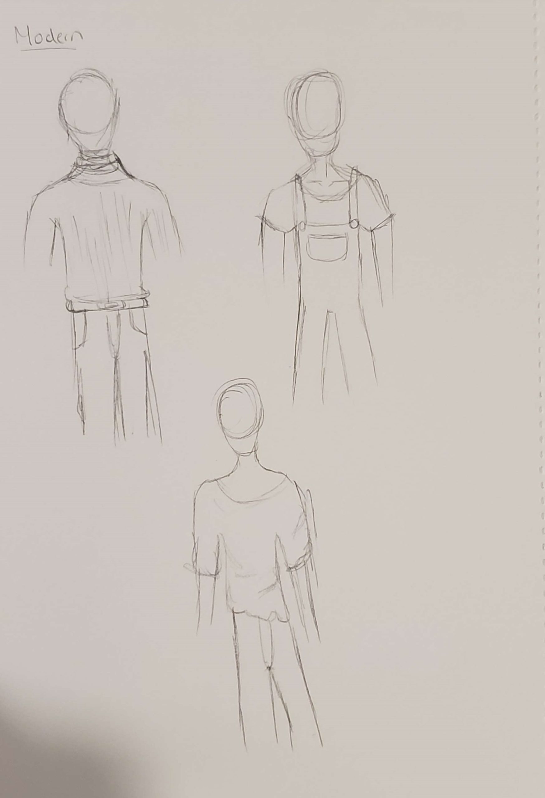 I wanted to explore the ideas of a more modern character like the character from my Scriptwriting module, so I designed modern outfits a painter would wear, but ultimately decided on traditional.