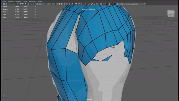 With the face, I started around the facial features e.g eyes, nose and mouth, worked around it then fill in the rest. To ensure accuracy throughout, I followed a tutorial I found online (FippedNormals, 2018) which gave insightful advice about how to do retopology efficiently. Additionally, as my model was created with symmetry, to maximise efficiency, I turned symmetry on ‘Object X’.