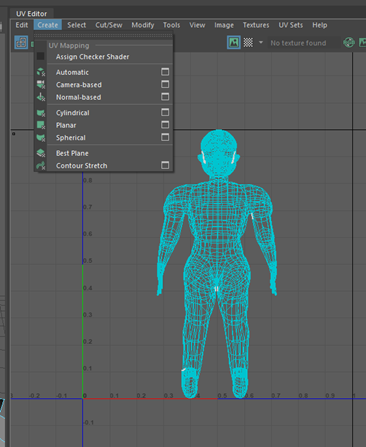 Once the retopology had been finalised, I moved onto the next step which was UV unwrapping. I decided to start with the body topology first. By opening the UV Editor and hovering over the ‘Create’ tab, I selected “Normal-based” then selected the ‘Cut/Sew’ tool, I went around the body and cut around the key loop areas such as the ears, eyes, arms, legs, etc.