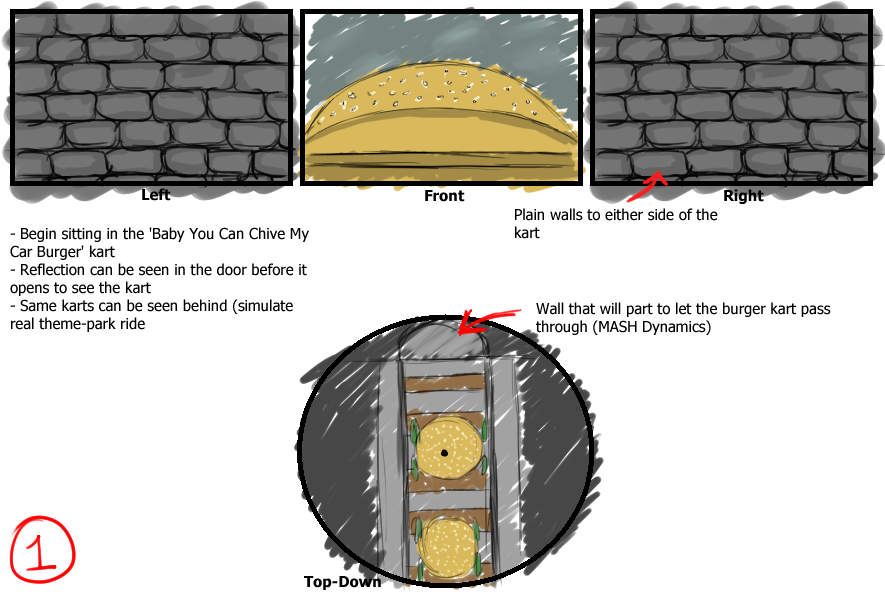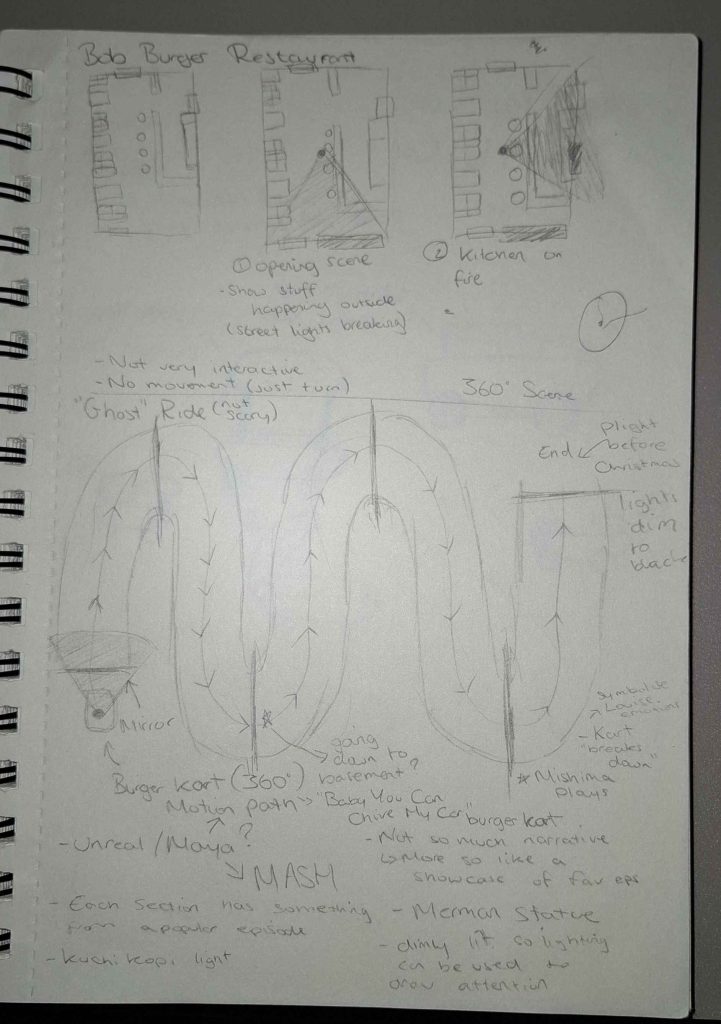 I feel as though the Bob’s Burgers ride would be a great opportunity for people who haven’t seen Bob’s Burgers to enjoy the immersive experience, compared to my first idea of a simple stationary 360° video; as I struggled to think of things that could be added to the scene as I felt very restricted.