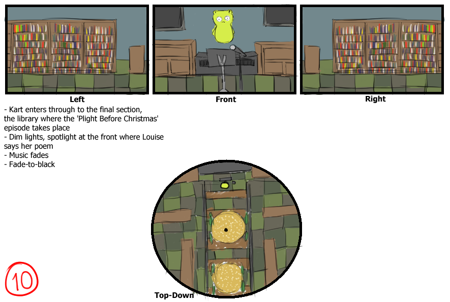 For the final section, I would like for it to tie up with the music that’s being played ‘Mishima (Bob’s Burgers Arrangement)’ from the episode ‘The Plight Before Christmas’; this will take the viewer to the library to where the episode takes place, and ultimately end there with floating baubles and snow VFX.
