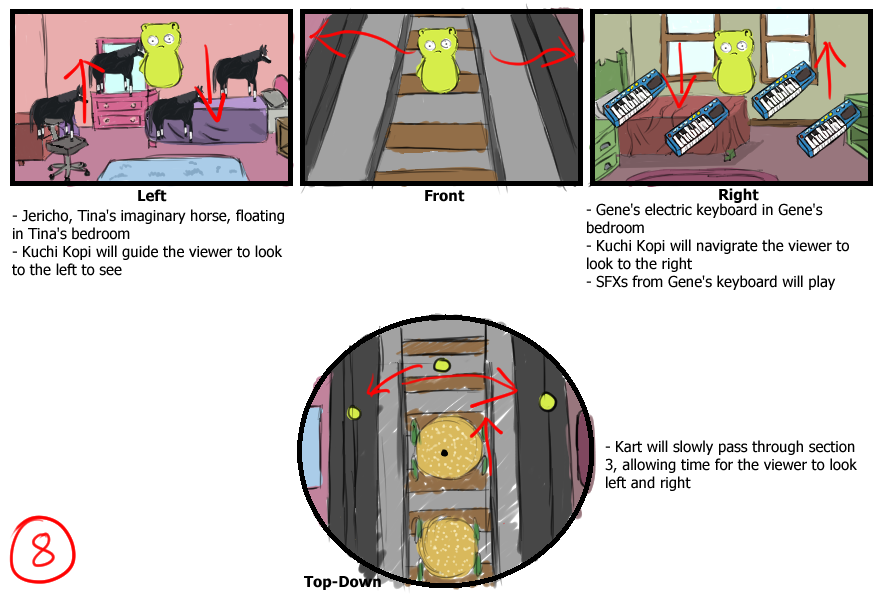 I intend on the production piece to be approximately 2 minutes long, as the duration for the audio for both the theme song and ‘Mishima (Bob’s Burgers Arrangement)’ totals up to about 2 minutes. Furthermore, upon researching immersive 360° videos, I didn’t want to have too many things happening around the viewer as they may forget things that happen if there are too many events; therefore, I plan to have the kart move slowly for each section allowing at least 20 seconds to view each area before moving onto the next section.