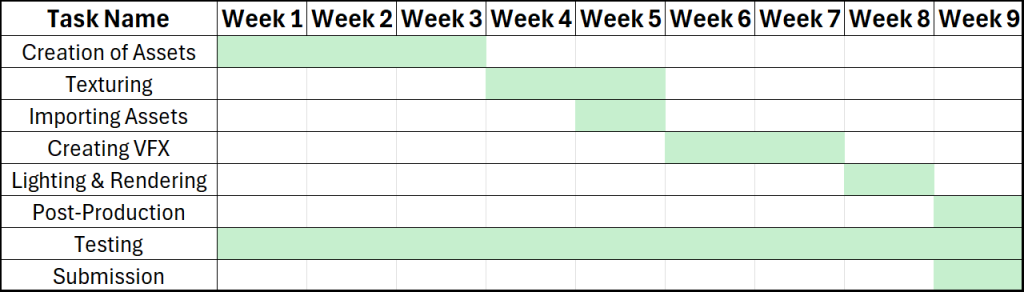 My next steps will be to create VFX for the video which hopefully won’t take too long as I have only 4 VFXs that are needed in my production piece, but I have given myself 2 weeks in case any issues come up. If I manage to finish quicker, it will give me some extra time to assign myself to another task that needs taking care of. Throughout the entire production stage, I will be testing to ensure that everything is working correctly and attempting to do minimal lighting before adjusting it at the end for rendering.