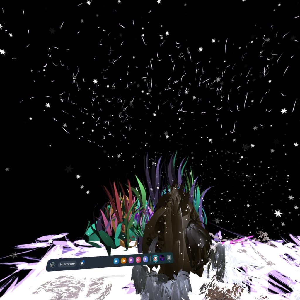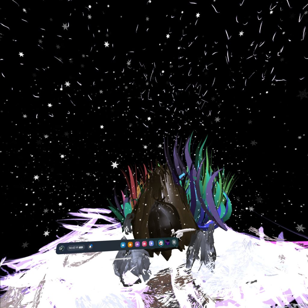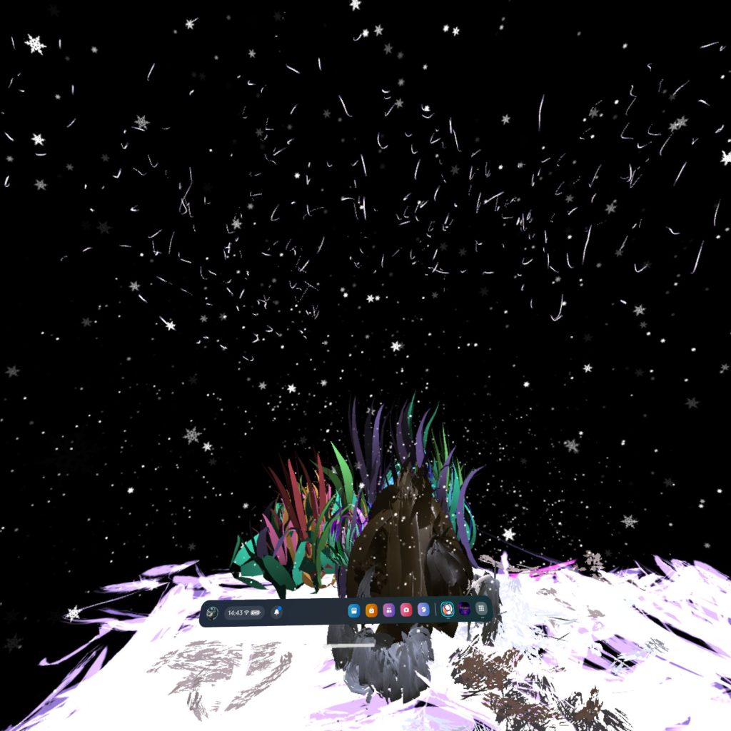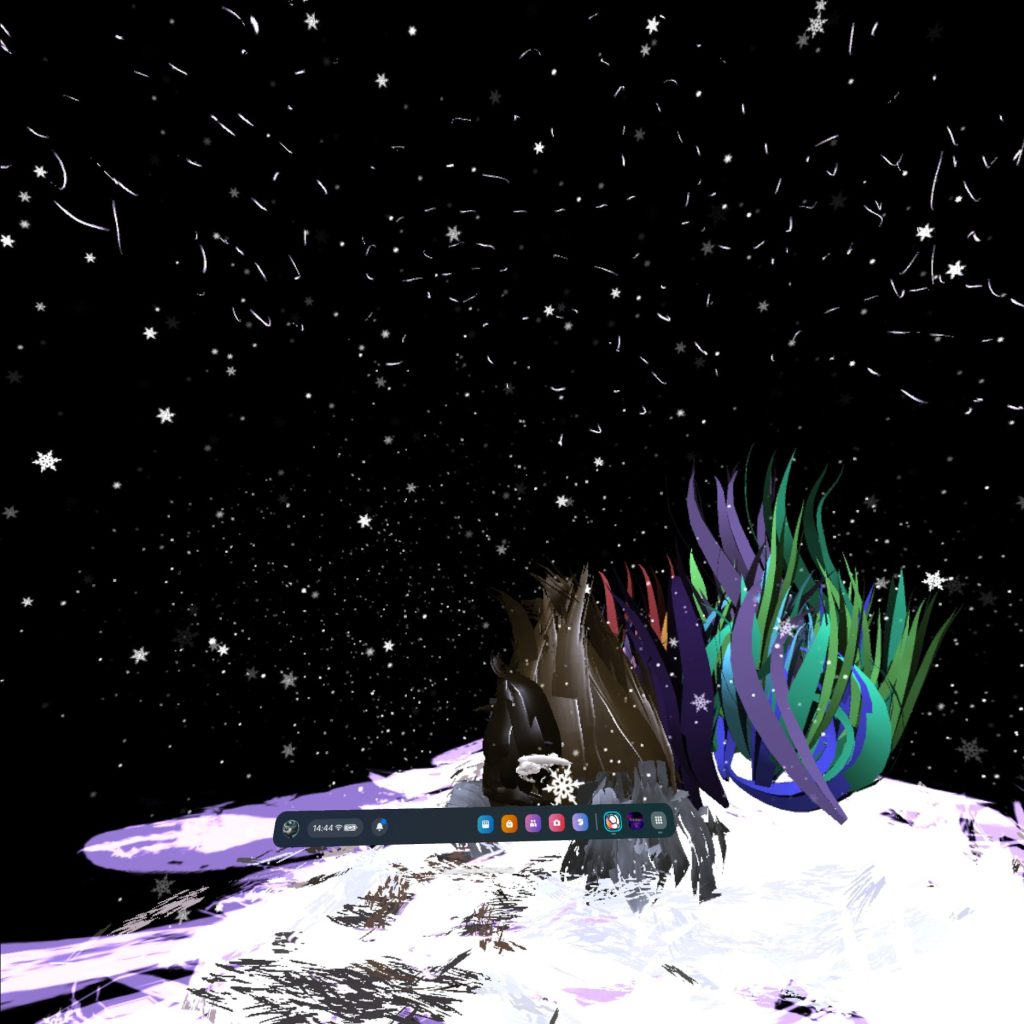 As I was creating the stars and dotting them around, I went around in a sphere which made me feel like I was in a snowglobe. With this idea, I decided to experiment with the ‘Snow’ brush and add them into the environment so it would appear like a snowglobe.